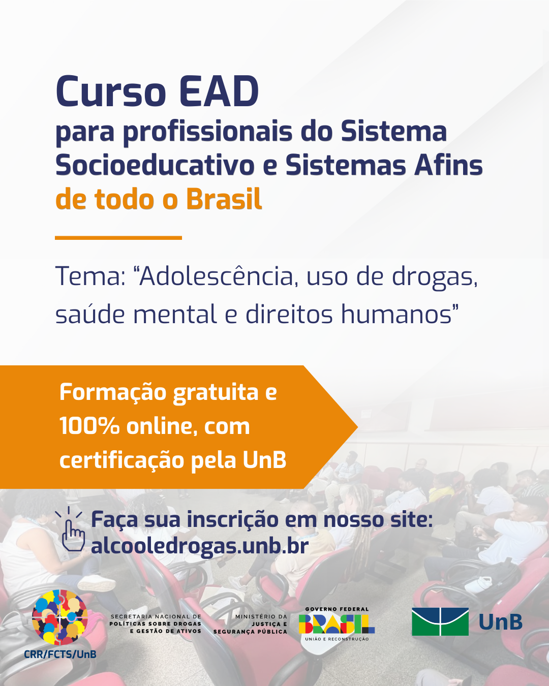 O CRR/UnB em parceria com a SENAD/MJSP oferece aos profissionais do Sistema Socioeducativo de todo o Brasil o curso EAD “Drogas, saúde mental e direitos humanos”.