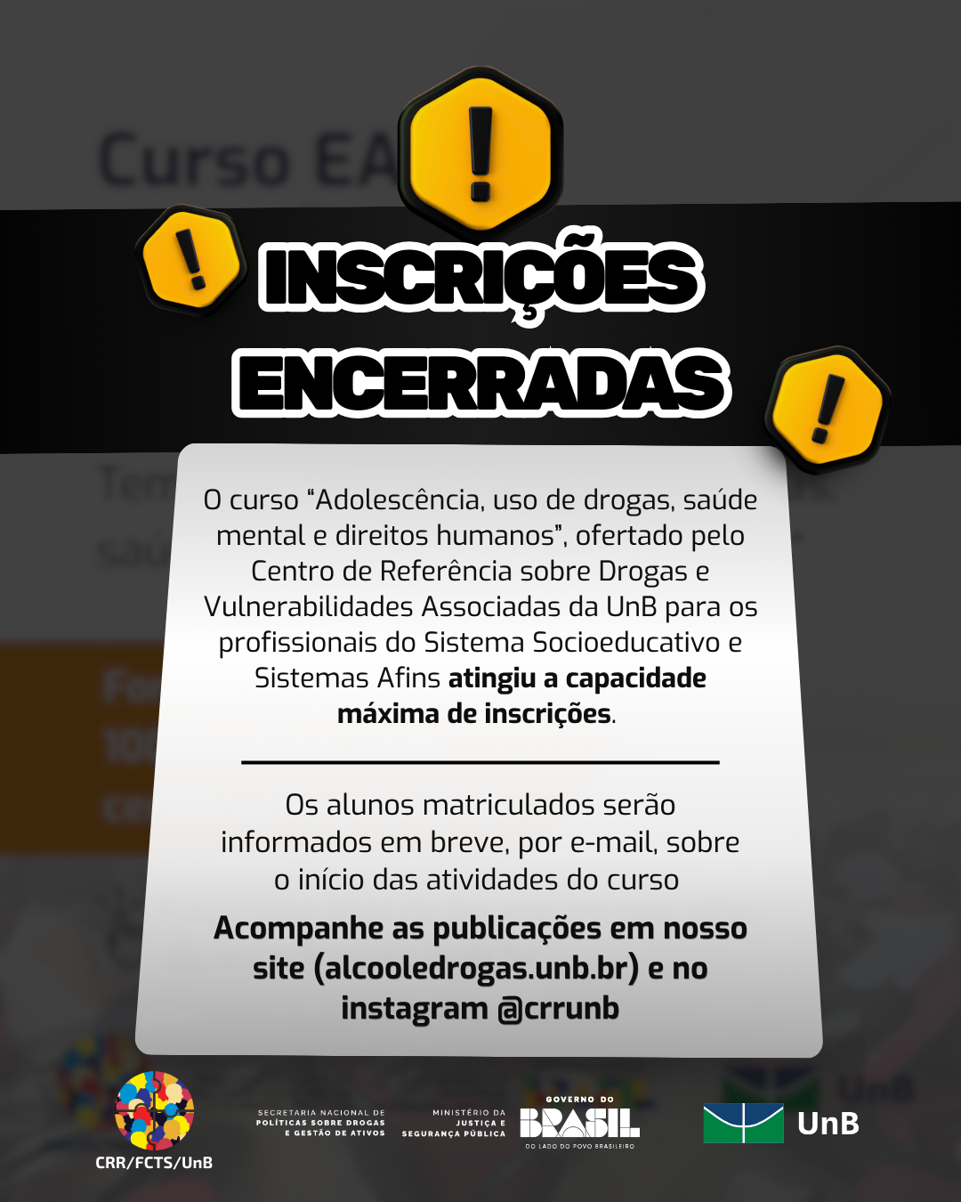 O CRR/UnB em parceria com a SENAD/MJSP oferece aos profissionais do Sistema Socioeducativo de todo o Brasil o curso EAD “Drogas, saúde mental e direitos humanos”.
