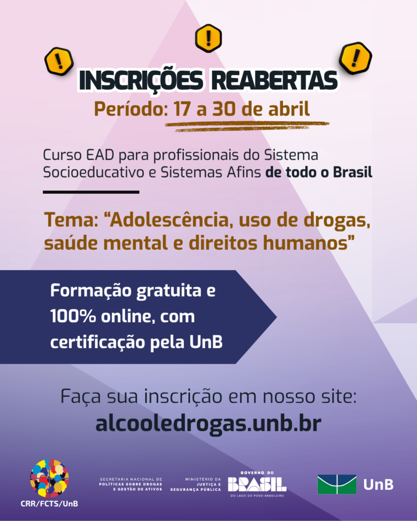 O Centro de Referências sobre Drogas e Vulnerabilidades Associadas da Universidade de Brasília (UnB), em parceria com a Secretaria Nacional de Políticas sobre Drogas e Gestão de Ativos do Ministério da Justiça e Segurança Pública, lança um novo curso 100% online, voltado para os profissionais do Sistema Socioeducativo e Sistemas Afins de todo o Brasil.